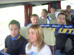 Come al solito, tante sono state le attività che hanno movimentato il viaggio d'andata! Innanzitutto abbiamo visto un bel video, preparato da Denis, che ha ripercorso il campionato e le attività del nostro club della scorsa stagione. Non poteva mancare il nostro giornalino "Inter nos", che è stato distribuito a tutti i partecipanti! Poi sotto con il gioco "indovina chi sono", che ha visto la vittoria pari merito di ben 5 persone! Sono stati così sorteggiati un orologio a muro nerazzurro, dei portachiavi e delle bottiglie di vino (offerte dal nostro sponsor "enoteca Piave")! Infine il gioco delle frasi famose, per il quale sono state messe in palio altre bottiglie! Ecco qui le foto dei vincitori!